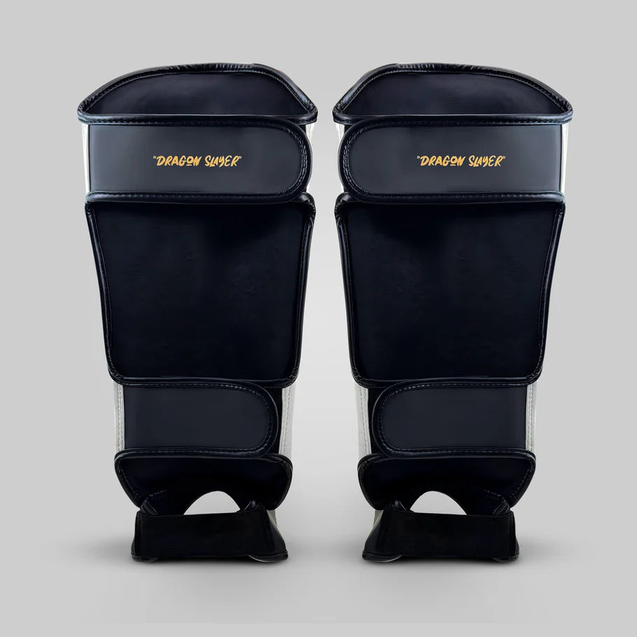 Protect your shins in style with the Fumetsu Dragon Slayer Shin Guards White/Black/Gold. Featuring the bold Dragon Slayer design and a premium white and gold finish, these guards don’t just look sharp — they perform too. The ergonomic, contoured shape ensures they sit comfortably and securely, offering reliable coverage for both shin and instep. Reinforced in all the right places, they give you confidence whether you're sparring or drilling.